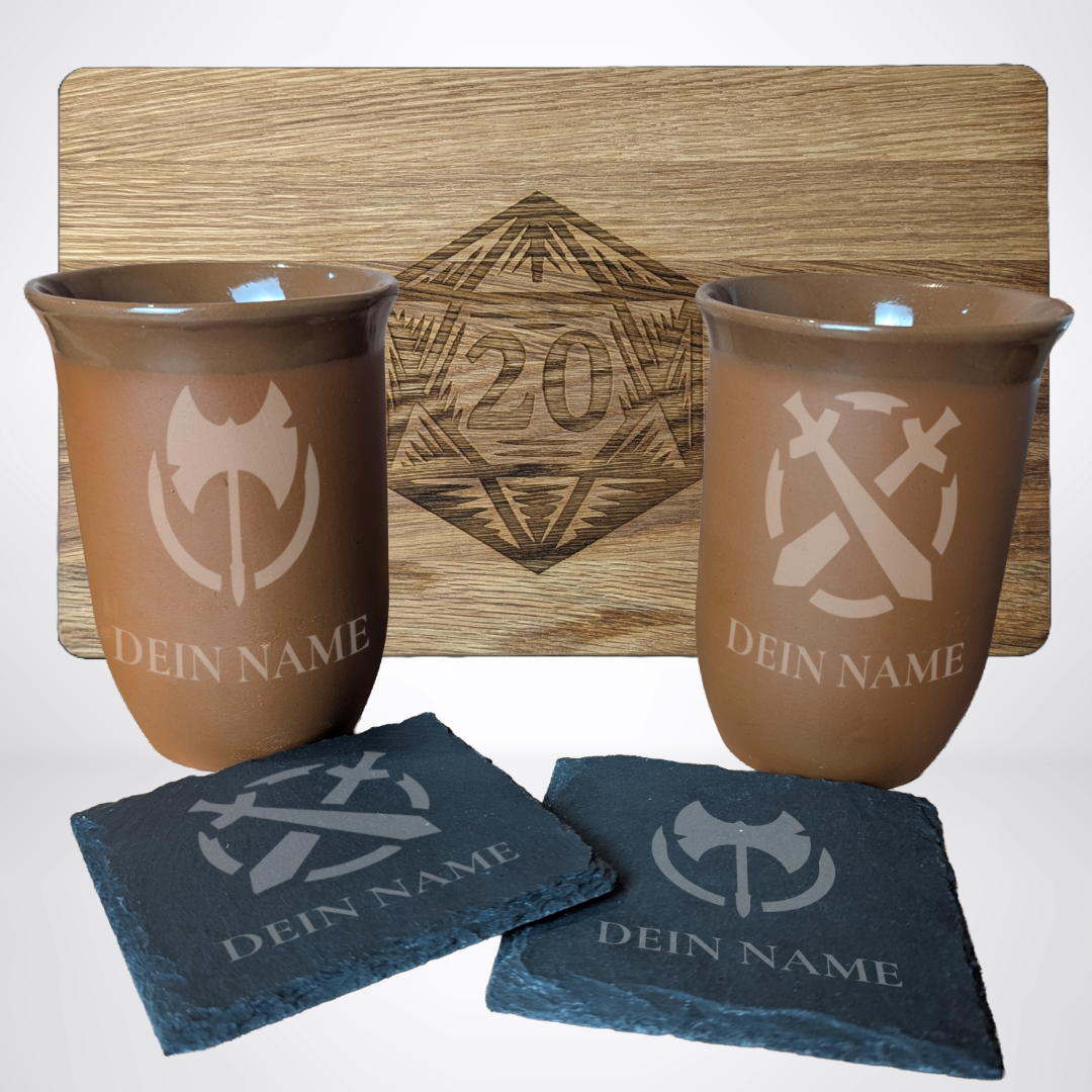 Tauche ein in dein nächstes Abenteuer – perfekt ausgestattet und stilvoll individualisiert mit dem exklusiven Pen & Paper Abenteuer-Bundle der Drachenschmiede. Enthalten sind zwei edle, robuste Tonbecher, die deine gewählte D&D-Klasse und deinen Namen stolz tragen. Dazu kommen zwei hochwertige Schiefer-Untersetzer mit passenden Gravuren, die deinem Charakter oder dir selbst ein unverwechselbares Erkennungszeichen geben.