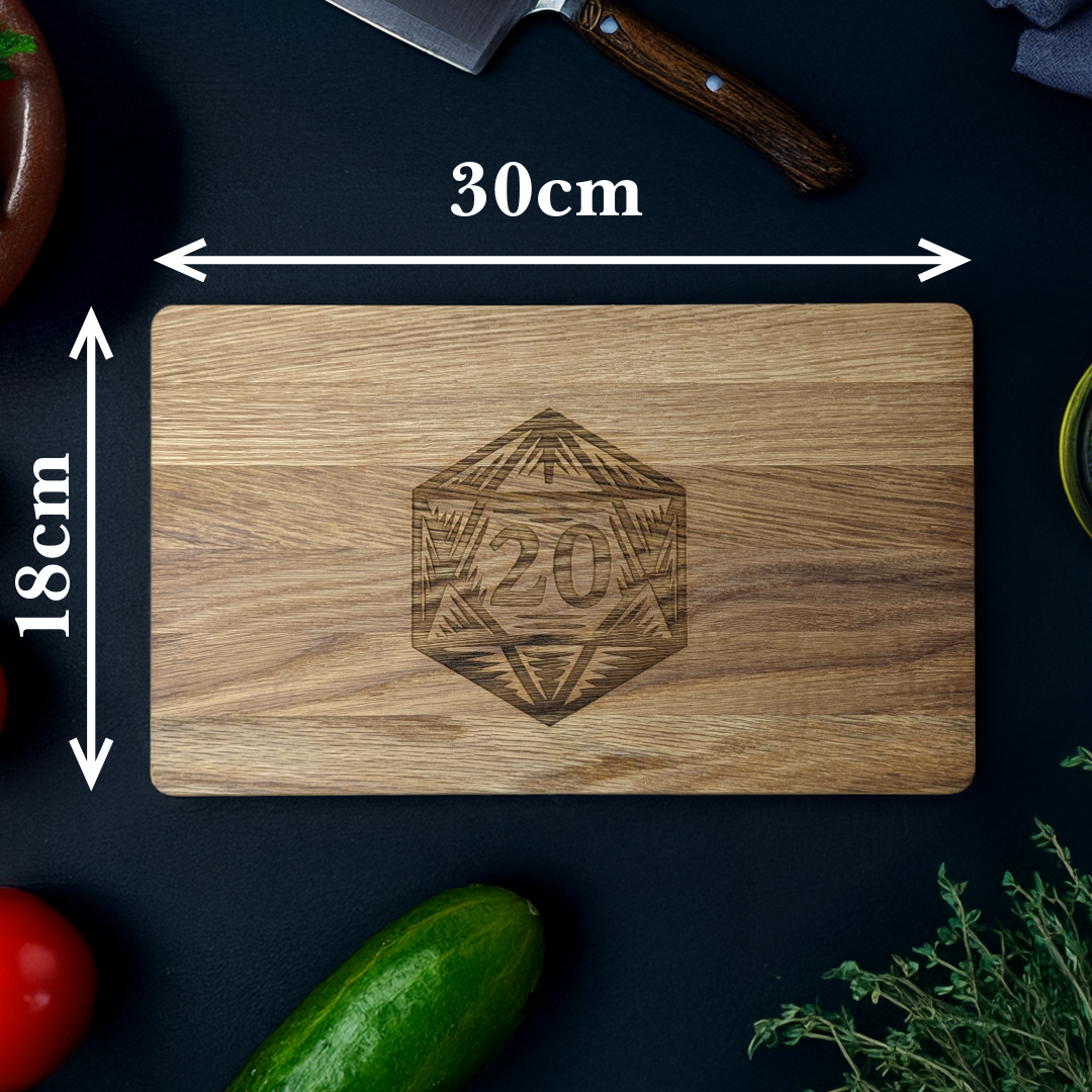 Das Set wird ergänzt durch ein edles Eichenholz-Schneidebrett, graviert mit dem legendären D20-Würfel, das sowohl IT am Lagerfeuer als auch OT in deiner Küche eine stilvolle Figur macht. Ideal als Geschenk oder als persönlicher Begleiter, der bei jedem Spielabend deinen Charakter lebendig werden lässt.